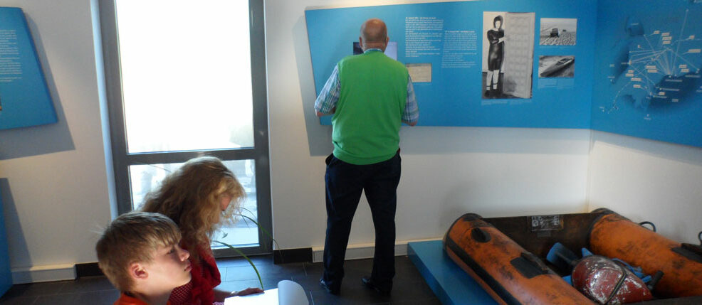 Das Originalfluchtboot der Familie Kostbade, die 1988 zu viert über die Ostsee flüchtete ist ausgestellt. Außenbordmotor, Ruder und anders Equipment geben ein authentisches Bild der Fluchtumstände. Eine Kopie des Kompasses von Peter Döbler, der in einer Kraftleistung nach Fehmarn schwamm steht Originalexponaten der Grenzer gegenüber wie Ausrüstung eines Streifensoldaten, Grenzhelferausweis oder Fernglas.